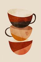 Deze stijlvolle illustratie toont een creatieve opstelling van koffiekopjes in warme aardse kleuren. Het strakke, minimalistische ontwerp en de harmonieuze kleuren maken dit kunstwerk ideaal voor het decoreren van keukens of cafés. Perfect voor koffieliefhebbers en fans van moderne kunst die een elegante en gezellige sfeer willen creëren.