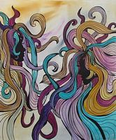 Een abstracte schildering in zachte pastelkleuren zand, beige, turquoise, paars en wit. De foto van twee zussen met lang, kleurrijk haar. Ook geschikt als canvasschilderij voor de kinderkamer.