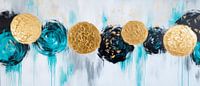 Glinsterende gouden cirkels dansen elegant tegen een achtergrond van diepe blauwe en zwarte tinten, die doen denken aan een meeslepende melodie. Deze eigentijdse compositie brengt licht en beweging in elke kamer. Het is bijzonder effectief in een woonkamer en creëert een harmonieuze en stijlvolle sfeer.