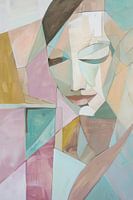 Deze indrukwekkende geometrische afbeelding van een vrouw betovert met een harmonieus kleurenpalet van koele pasteltinten. De veelzijdige vormen en strakke lijnen voegen diepte en complexiteit toe aan de afbeelding, terwijl de zachte blauwe, paarse en beige tinten een rustgevende en toch dynamische sfeer creëren. Ideaal voor moderne woonruimtes en kunstliefhebbers die op zoek zijn naar een stijlvolle en contemplatieve wanddecoratie. Dit kunstwerk brengt een verfijnde elegantie en tijdloze schoonheid in elke omgeving.
