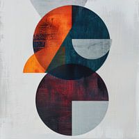 Deze verbluffende abstracte compositie maakt gebruik van felle kleuren en geometrische vormen om een dynamische en visueel aantrekkelijke weergave te creëren. De harmonieuze mix van diepblauw, fel oranje en donkerrood creëert een sterke visuele interesse, terwijl de halve cirkels en texturen diepte toevoegen aan de afbeelding. Ideaal voor moderne woonruimtes en kantoren die op zoek zijn naar een stijlvolle en energieke wanddecoratie. Dit kunstwerk brengt zowel elegantie als levendigheid in elke omgeving.