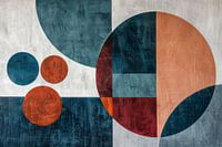 Deze verbluffende abstracte compositie maakt gebruik van felle kleuren en geometrische vormen om een dynamische en visueel aantrekkelijke weergave te creëren. De harmonieuze mix van diepblauw, fel oranje en donkerrood creëert een sterke visuele interesse, terwijl de halve cirkels en texturen diepte toevoegen aan de afbeelding. Ideaal voor moderne woonruimtes en kantoren die op zoek zijn naar een stijlvolle en energieke wanddecoratie. Dit kunstwerk brengt zowel elegantie als levendigheid in elke omgeving.