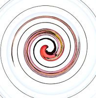 Deze afbeelding toont een hypnotiserende spiraal die zich van buiten naar binnen kronkelt, met een dynamisch kleurverloop van zwart en rood naar roze en geel. Het is een abstract kunstwerk dat speelt met beweging, diepte en visuele illusie.