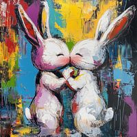 Abstracte kussende konijnen schilderij die een prachtige toevoeging zal zijn aan elke ruimte. Met zijn unieke en stijlvolle uitstraling is het een ware eyecatcher. De schitterende kleuren en het bijzondere ontwerp maken dit kunstwerk 100% uniek en origineel. Het is de perfecte fotoprint om je interieur helemaal af te maken.