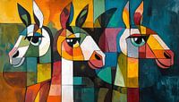 Het abstracte lama's panorama schilderij is een speels en eigentijds kunstwerk dat karakter en kleur samenbrengt in een originele compositie. In dit panorama worden drie lama’s afgebeeld in een fantasierijke en abstracte stijl, met vervormde vormen, levendige expressies en verrassende details. De lama’s lijken bijna tot leven te komen door hun unieke houdingen en artistieke uitstraling, wat het werk een vrolijke en opvallende sfeer geeft.