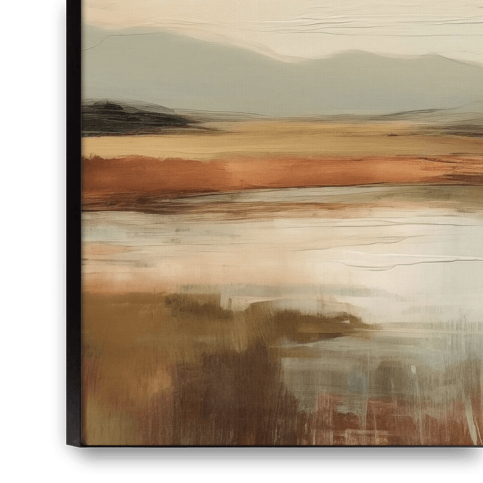 Een rustig landschap in warme aardetinten geeft de stille schoonheid van de natuur en de eindeloze open ruimte weer. Zachte horizonten en subtiele weerspiegelingen zorgen voor een rustgevende sfeer, perfect om warmte en sereniteit aan uw huis toe te voegen.