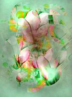 Digital Art van een originele aquarel en diverse abstracte vormen in groene en roze tinten. Het gezicht van een egyptische figuur en een deel van de zodiac van Dendera. Mooi als schilderij voor aan de muur van de woonkamer of slaapkamer.