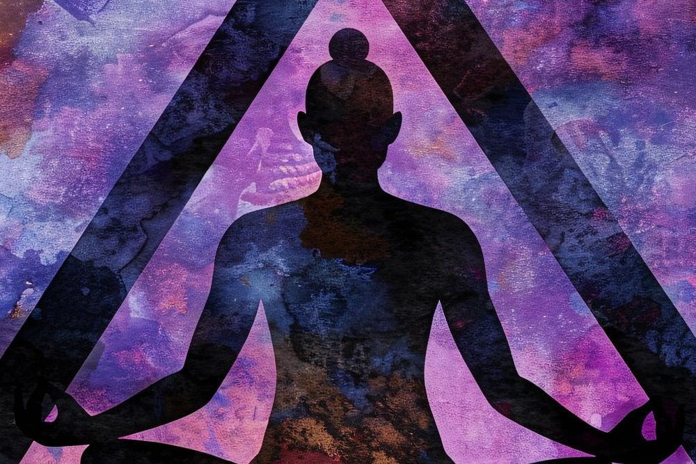 Deze intrigerende kunstuiting vermengt de kalme houding van meditatie met een levendige achtergrond van abstracte, expressionistische kleuren. Het centrale figuur, zittend in een klassieke meditatiehouding binnen een prominente driehoek, straalt een aura van rust en contemplatie uit. Dit stuk speelt met visuele contrasten en texturen, wat het een dynamische toevoeging maakt aan elke moderne woon- of werkomgeving. De samensmelting van rustgevende tonen met explosieve kleuren vertegenwoordigt een harmonie tussen innerlijke rust en externe chaos.