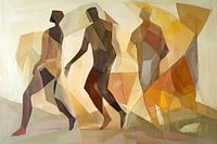 Dit kunstwerk brengt menselijke figuren op een unieke en abstracte manier tot leven. De compositie bestaat uit geometrische vormen en vloeiende lijnen die beweging en dynamiek suggereren. De warme kleuren zoals bruin, beige en oranje zorgen voor een harmonieuze en stijlvolle uitstraling. Dit schilderij past perfect in moderne interieurs en voegt een artistieke flair toe aan elke ruimte. Door de subtiele overlapping van vormen en de speelse contrasten krijgt het werk een diepte die blijft intrigeren. Ideaal voor wie houdt van eigentijdse kunst met een kubistische inslag. Dit stuk is een echte blikvanger in woonkamers, kantoren of andere inspirerende ruimtes. Laat je meevoeren in de beweging van dit fascinerende ontwerp!
