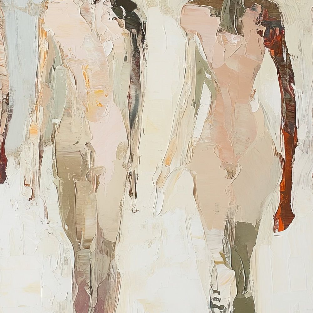 Details: abstract schilderij, vrouwen schilderij, figuren, huidtinten, modern, kunst, beweging, neutrale kleuren, schilderij mensen, samenkomst
