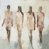 Abstracte mensen in beweging - Op dit abstract schilderij zie je vier figuren die in een lichte, neutrale kleurenpalet verschillende tonen van huid benadrukken, met een vloeiende, dynamische uitstraling die beweging en een gevoel van samenkomst uitstraalt.