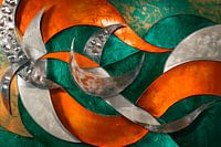 Dynamische golven dansen over een diepgroen oppervlak in heldere oranje tinten en glinsterend zilver. De harmonieuze combinatie van metaal en kleur geeft een gevoel van beweging en energie. Dit kunstwerk wordt het hoogtepunt van een moderne woonkamer, waar het gesprekken stimuleert en de kamer vult met levendige creativiteit.