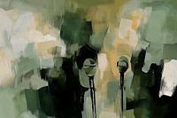 Dit moderne kunstwerk combineert een abstracte compositie met subtiele, zachte tinten van groen, geel en beige. De twee microfoons die centraal in het ontwerp staan, zorgen voor een speelse en mysterieuze uitstraling. De lagen en penseelstreken creëren diepte en textuur, waardoor het een veelzijdige keuze is voor verschillende interieurs. Dit schilderij past perfect in een kantoor, woonkamer of muziekkamer en biedt een verfijnde balans tussen rust en dynamiek. Ideaal voor liefhebbers van abstracte kunst met een moderne twist.