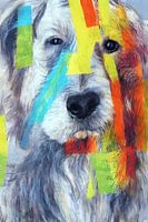 Dit kunstwerk toont een grijs-witte hond op de achtergrond. Op de voorgrond zijn duidelijk de felgekleurde verfstreken te zien.