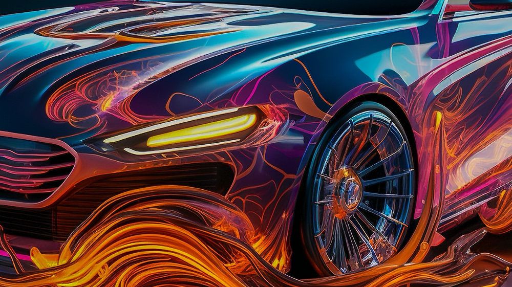 Abstracte neonkunst voor een auto in vlammen