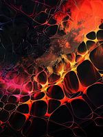 Dit schilderij toont een abstracte compositie die wordt gekenmerkt door organisch ogende gaasstructuren en heldere kleurovergangen. De dominante kleuren zijn rood, oranje, geel en zwart, met accenten in paars en roze. De vormen doen denken aan cellen of neuronale netwerken die verbonden zijn door een complex netwerk. De vloeiende…