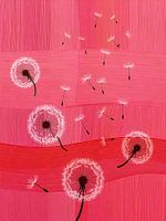 Modern werk van Paardenbloemen (Dandelions) met dwarrelende vruchtpluizen in de wind.