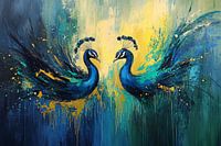 Dit kleurrijke kunstwerk toont twee pauwen in een abstracte stijl die energie en elegantie uitstraalt. De rijke kleurencombinatie van blauw, groen en goud, gecombineerd met dynamische penseelstreken, creëert een levendige en expressieve compositie. Perfect om elke ruimte een vleugje moderne verfijning te geven, dit ontwerp vangt de majestueuze schoonheid van pauwen en combineert deze met een unieke artistieke flair. Ideaal voor liefhebbers van dieren en abstracte kunst, het schilderij brengt leven in woonkamers, eetkamers en andere interieurs. Laat uw muur stralen met deze prachtige weergave van natuur en kunst.