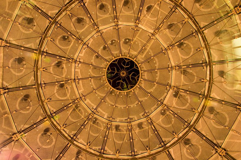 Hier heb ik een statief gebruikt en onder een rechte hoek naar boven gefotografeerd. De foto is 's avonds laat genomen, zodat er geen licht van buitenaf zichtbaar was en alleen het licht dat van onderen op de koepel weerkaatst binnen de koepel werd gebruikt.