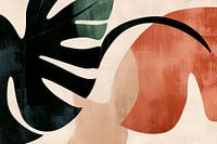 Een harmonieuze compositie van levendige bladvormen ontvouwt zich in zachte aardetinten en smelt samen in gedurfde, gebogen lijnen. De diepe schaduwen van zwart contrasteren met warme terracotta en lichte, zachte accenten, waardoor een subtiele dynamiek ontstaat die de kijker meeneemt naar een vredige, botanische wereld.