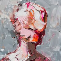 Het schilderij toont een gestileerde menselijke figuur in profiel, waarvan het hoofd en de schouders zijn vastgelegd in levendige, dichte penseelstreken. Het kleurenpalet van roze, bruin en oranje geeft de voorstelling een spookachtige warmte, terwijl de onscherpe achtergrond de contouren benadrukt en het hoofdmotief in beeld brengt.…