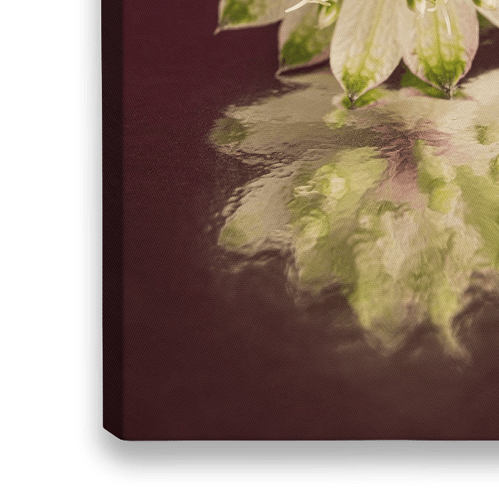 "Abstracte reflectie: Een stilleven van een bloemetje van een Zeeuws Knoopje" is een macrofoto van een enkel een klein bloemetje van een Zeeuws Knoopje. Dit bloemetje is crème - wit van kleur met olijfgroene en roze details.
