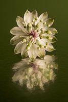 In deze foto: "Abstracte reflectie: Zeeuws Knoopje in bloei" zie je een stilleven van een klein bloemetje van het Zeeuws Knoopje. Dit kleine fragiele crème-witte met olijfgroene bloemetje lijkt bijna te zweven boven de reflecterende ondergrond.