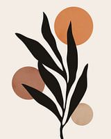 Abstracte minimalistische illustratie een plant in combinatie met cirkels. De natuurlijke tinten geeft het geheel een echte boho stijl. De cirkels hebben een subtiele witte verf structuur. De achtergrond is licht beige.