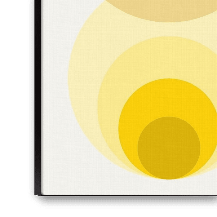 Een abstract schilderij met organische geometrische cirkelvormen in moderne gele kleuren met een impressie van Scandinavische kunst uit Noord-Europa met een vleugje Japandi en retro vintage cultuur.