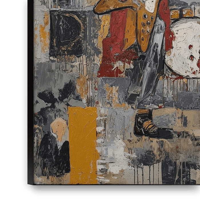 Abstracte rock muzikanten schilderij toont een energieke en expressieve compositie waarin muziek en kunst samenkomen in een moderne, artistieke vorm. In dit dynamische tafereel zie je twee gitaristen en een drumstel, krachtig neergezet met vloeiende lijnen en abstracte vormen die beweging en ritme voelbaar maken. De muzikanten worden op…