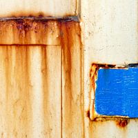 Een Mondriaan-achtige grafische compositie gevormd door een geel-oranje gekleurde roestige wand met een opvallend contrasterend blauw opgelast vlak.