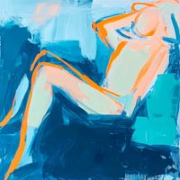 Een speels samenspel van rust en levendigheid ontvouwt zich in zachte blauwe en oranje tinten. De abstracte figuur straalt een zorgeloze sereniteit uit, terwijl de dynamische streken beweging suggereren. Een fascinerend spel van licht en schaduw trekt de aandacht en nodigt uit tot interpretatie.