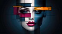 Dit kunstwerk vangt het contrast tussen organische schoonheid en technische fragmentatie. Het gezicht in het midden wordt doorkruist door geometrische vormen die de natuurlijke structuur snijden en vervormen in felle kleuren zoals oranje, roze en blauw. De scherpte van de lijnen werkt als een digitaal masker dat het menselijke gezicht binnendringt en opbreekt, terwijl de koele achtergrond de indruk van kunstmatigheid en afstand versterkt.