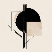 Een harmonieuze compositie van geometrische vormen ontvouwt zich met heldere lijnen en sterke contrasten. Een dominante zwarte cirkel ontmoet een zacht, bleek vierkant, terwijl delicate streken het samenspel dynamisch benadrukken. Dit minimalistische ontwerp wekt diepe nieuwsgierigheid en nodigt uit tot een visuele ontdekkingsreis.
