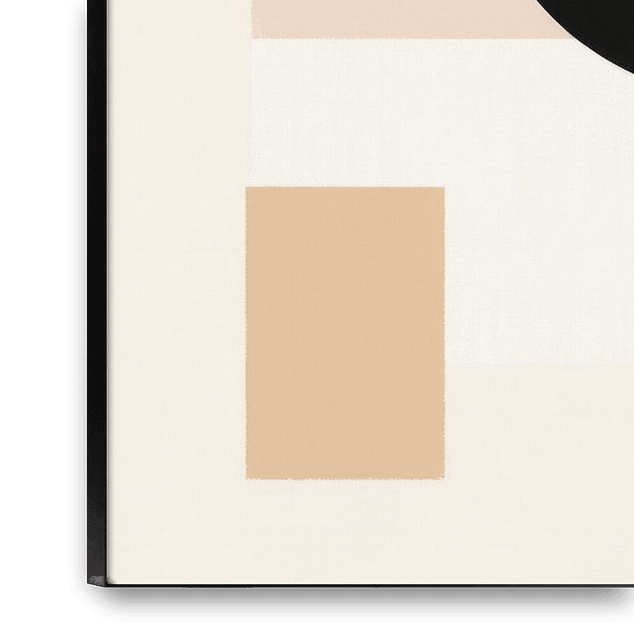 Er ontvouwt zich een fascinerend spel van vormen en kleuren: een krachtige zwarte cirkel contrasteert levendig met zachte beige nuances. Geometrische lijnen trekken de aandacht, terwijl heldere structuren en organische elementen een harmonieuze dialoog aangaan. Deze compositie straalt een kalme maar dynamische esthetiek uit die…