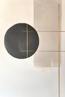 Met een opvallende zwarte cirkel die rust uitstraalt en zachte, lichtgekleurde oppervlakken die een gevoel van lichtheid uitstralen, creëert dit kunstwerk een harmonieus evenwicht. De fijne houten lijnen geven het ontwerp structuur en elegantie. Perfect voor de woonkamer, waar het een gesprek stimuleert en een stijlvolle sfeer creëert.
