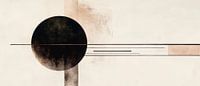Geometrische helderheid en harmonieuze contrasten komen samen in een compositie van zachte aardetinten en diep zwart. De grote, zwarte cirkel trekt de aandacht en wordt omlijst door fijne lijnen die beweging suggereren. Perfect voor de woonkamer, waar het schittert als een centraal element in een moderne sfeer.