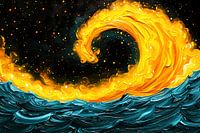 Dit prachtige abstracte schilderij vangt de kracht van natuurkrachten in een unieke artistieke weergave. De vurige, gouden vlammen dansen energiek boven de diepe, golvende oceaan, wat een dynamisch contrast creëert. De spetters en stippen die de achtergrond vullen, geven een gevoel van beweging en leven. Dit kunstwerk brengt een explosie van kleur en energie in elke ruimte en past perfect in moderne woonkamers of kantoren. Het biedt niet alleen een visueel spektakel, maar nodigt ook uit tot reflectie over de kracht en schoonheid van de natuur. Een perfecte aanvulling voor wie houdt van dynamische en expressieve kunst.