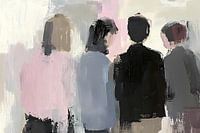 Dit abstracte schilderij brengt een mysterieuze sfeer met zich mee en is perfect voor moderne interieurs. De zachte penseelstreken en subtiele kleurcontrasten geven het beeld een dromerige uitstraling, terwijl de silhouetten van mensen een gevoel van saamhorigheid oproepen. De combinatie van koele en warme tinten zorgt voor een gebalanceerde compositie die in verschillende ruimtes tot zijn recht komt. Of het nu in een woonkamer, kantoor of galerie wordt geplaatst, dit kunstwerk trekt de aandacht zonder opdringerig te zijn. Het nodigt uit tot interpretatie en prikkelt de verbeelding van de toeschouwer. Een subtiele maar krachtige toevoeging aan elke kunstcollectie.