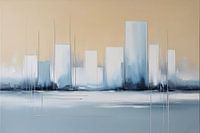 Dit abstracte kunstwerk toont een serene skyline, opgebouwd uit eenvoudige, geometrische vormen. De zachte kleurovergangen in tinten van beige, blauw en wit zorgen voor een rustige sfeer, perfect voor moderne interieurs. De minimalistische stijl en het subtiele gebruik van lijnen en vormen geven het ontwerp een verfijnde, tijdloze uitstraling. Dit kunstwerk past goed in een woonkamer of kantoor, waar het een gevoel van kalmte en balans creëert. Of je nu houdt van moderne kunst of op zoek bent naar een stuk dat elegantie toevoegt aan je ruimte, dit schilderij biedt een perfecte mix van eenvoud en verfijning.