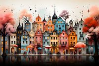 Een kleurrijke illustratie toont een abstract stadsgezicht voor een kinderboek. Hoge, kleurrijke gebouwen met speelse vormen en levendige kleuren strekken zich uit tot in de hemel. Het tafereel straalt een warme en uitnodigende sfeer uit en stimuleert de verbeelding van kinderen en iedereen die jong van hart is.