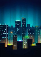 Een zeer gestileerde en abstracte weergave van een stad bij nacht, gekenmerkt door donkere silhouetten van gebouwen omlijnd met heldere, gloeiende neonlijnen in blauw, roze en geel. Het minimalistische maar levendige ontwerp tegen een diepblauwe sterrenhemel geeft een duidelijke retro-futuristische of synthwave-esthetiek.