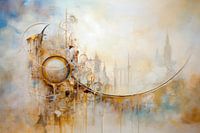 Een dromerige stad verrijst uit zachte mist, waar gouden cirkels en lijnen de horizon verbinden. Het schilderij straalt mysterie, elegantie en tijdloze harmonie uit.