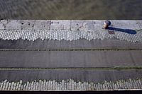Vanuit een hoog standpunt toont deze foto een verstild stuk kade, waar lijnen en structuren samenkomen. Het water, de kasseien, het asfalt en de rails vormen een grafisch patroon, versterkt door het strijklicht en de lange schaduwen. Een minimalistisch stadslandschap met een serene, bijna abstracte uitstraling.