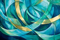 Zachte golven van turquoise en goud ontvouwen zich in harmonieuze bewegingen en nodigen de kijker uit om te dromen. De vloeiende vormen stralen rust en elegantie uit, perfect voor een stijlvolle woonkamer of een inspirerende kantooromgeving waar creativiteit en sereniteit hand in hand gaan. Ideaal om een ontspannen sfeer te creëren.