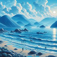 Een blauwe zee gecreëerd door A. I. Een niet bestaande zee , strand en bergen op de achtergrond. Mijn gedachte was om iets in de stijl van David Hockney te maken. Hij schildert vaak beelden die niet bestaan, een beetje futuristisch. Maar een blauwe zee associëren wij toch wel vaak met vakanties , vrijheid en genieten van zon , zee en zon.