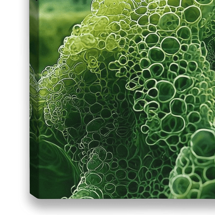 Ingewikkelde groene draden verstrengelen zich, waardoor een complex netwerk ontstaat dat doet denken aan plantenvezels of microscopische structuren. Het ontwerp is rijkelijk gedetailleerd met verschillende groentinten, wat een gevoel van diepte en beweging geeft.