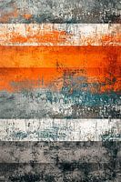 Geometrische kunst: structuur in kleur. Deze abstracte compositie boeit met zijn horizontale strepen in sterk oranje en koele blauwtinten, die doen denken aan verweerde oppervlakken. De ruwe texturen en versleten oppervlakken vertellen verhalen van tijd en verandering. Dit werk brengt een opvallende, industriële esthetiek in elke kamer…