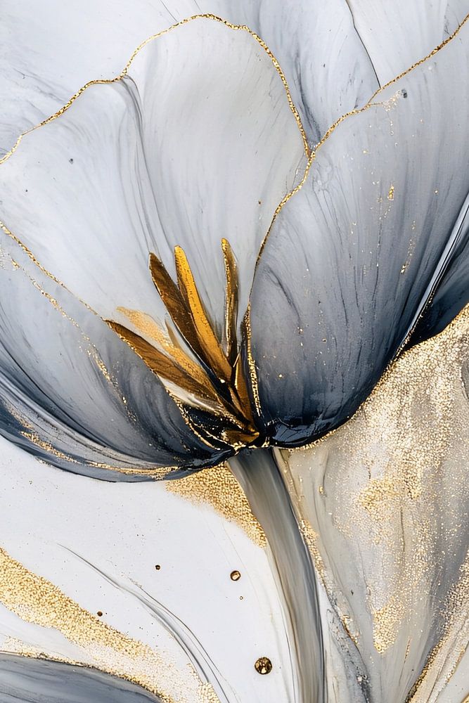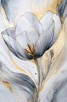 Dit ontwerp toont een prachtige abstracte tulp, weergegeven in zachte wit- en grijstonen, met elegante gouden accenten die de contouren van de bloem benadrukken. De vloeiende lijnen en het minimalistische kleurgebruik creëren een rustgevend en verfijnd geheel, ideaal voor moderne interieurs. Het gouden detail voegt een vleugje luxe toe, waardoor het niet alleen geschikt is voor een woonkamer of slaapkamer, maar ook perfect past in een kantoorruimte waar elegantie en eenvoud samenkomen. Dit ontwerp straalt een serene sfeer uit die zowel modern als tijdloos is, en het geeft elke ruimte een verfijnde en stijlvolle uitstraling.