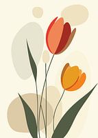 Deze minimalistische afbeelding toont twee gestileerde tulpen in warme oranje, rode en gele tinten. De vormen zijn helder en modern, aangevuld met organische, pastelkleurige achtergrondelementen in beige en grijs. De bladeren en stelen van de tulpen hebben een donkergroene kleur en vormen een mooi contrast met de bloemen. De compositie…
